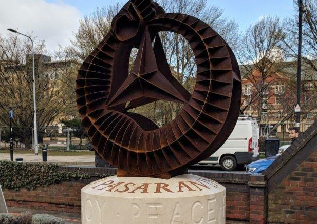 on which are inscribed the words ‘¡No pasarán!’ and ‘Peace,