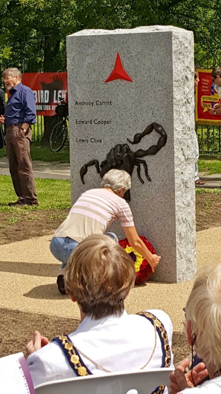Though there is already a plaque inside the city’s Guildhall, the families and the IBMT-affiliated Hull International Brigades Memorial Group felt that a more substantial monument should be raised. They persuaded the city council to provide a site next to the Guildhall and raised the funds, mainly from local trade unions.